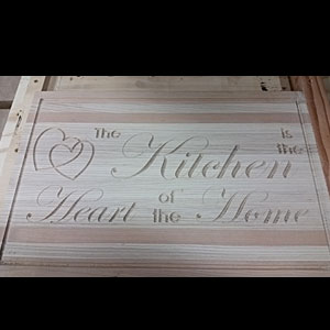 Made of Hard Maple and Cherry, almost 2 inches thick and about 12” x 18”. This board is inlaid in coffee and sanded smooth. This boards is finished with a wax and mineral oil for protection. The carving is done on the CNC and designed in Aspire8.0.