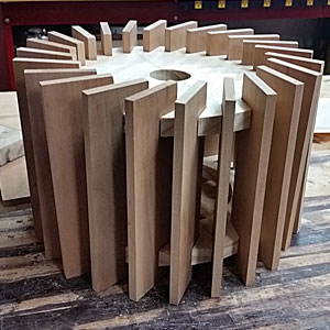Made of Cherry and Poplar, cut on CNC and shop tools, hand assembled. Finished with a coat of lacquer sprayed on.